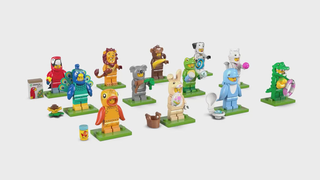 Girls and boys ages 5 and up can play out fun stories with 1 of 12 collectible figures from the LEGO® Minifigures Animal Series 28 (71051) small animal toy mystery boxes. There is 1 surprise LEGO minifigure in each box and a total of 12 charactersto collect including toy figures wearing parrot, lion, frog, crocodile, Dalmatian, goldfish, cute bunny, peacock, fluffy cat, koala, dolphin and monkey costumes. Each of the 12 minifigures comes in a sealed mystery box, and all are accompanied by at le ast 1 accessory. These detailed cute animal toys can be added to an existing collection, proudly displayed or used to create fun-filled stories. This small gift for kids who like animals and nature is a fun treat and inspires great storytelling and countless hours of playtime on their own or with friends.