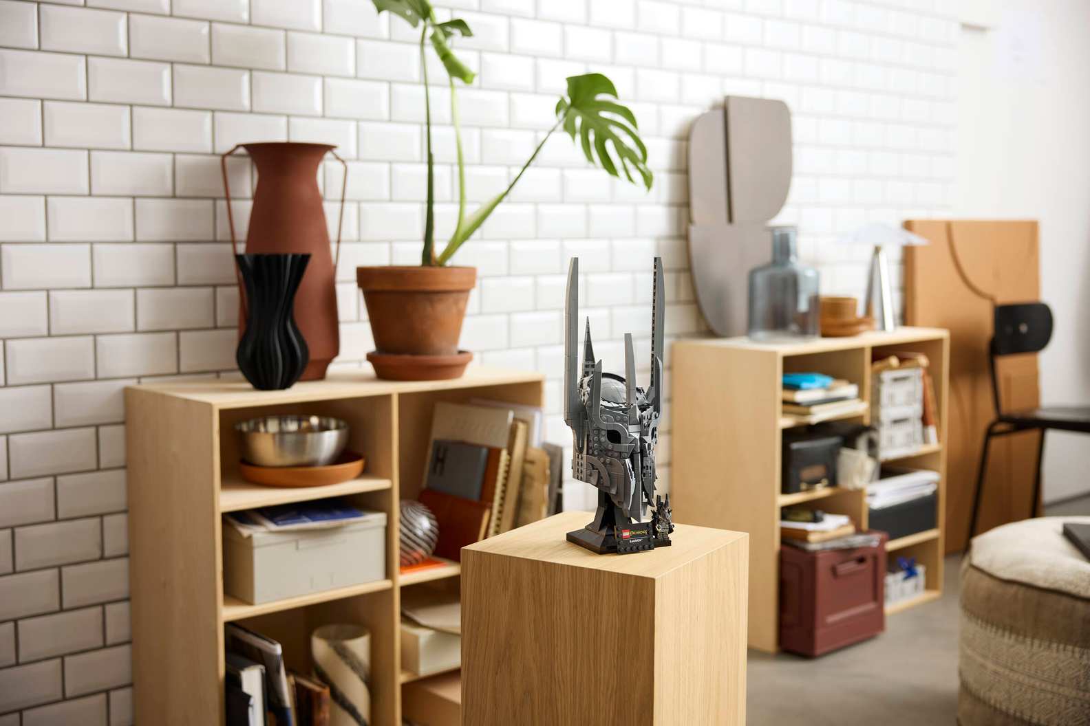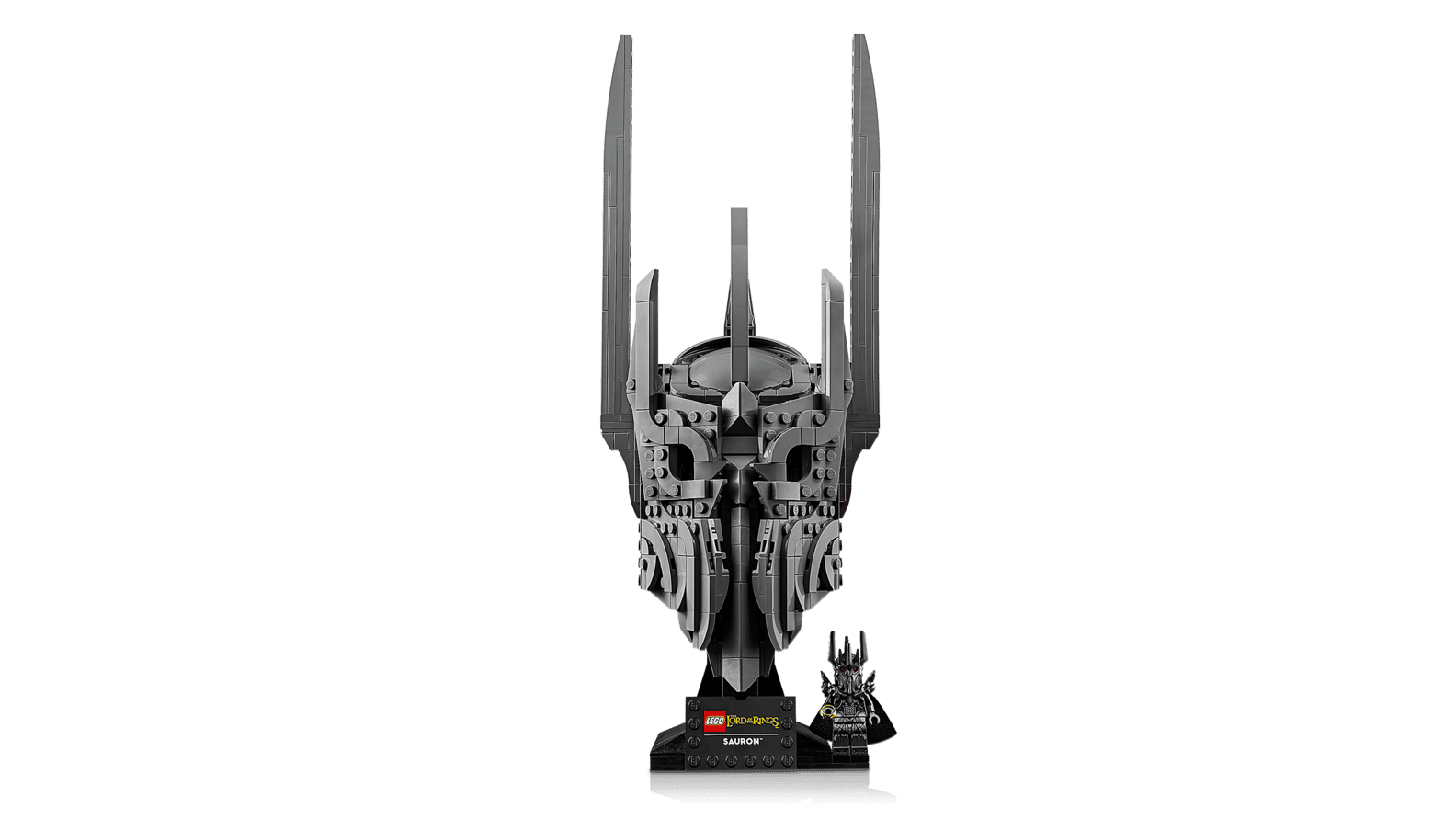 - WHAT’S IN THE BOX – Includes everything you need to craft a replica of Sauron’s helmet, plus a display stand and name plaque along with a Sauron™ minifigure holding The One Ring
