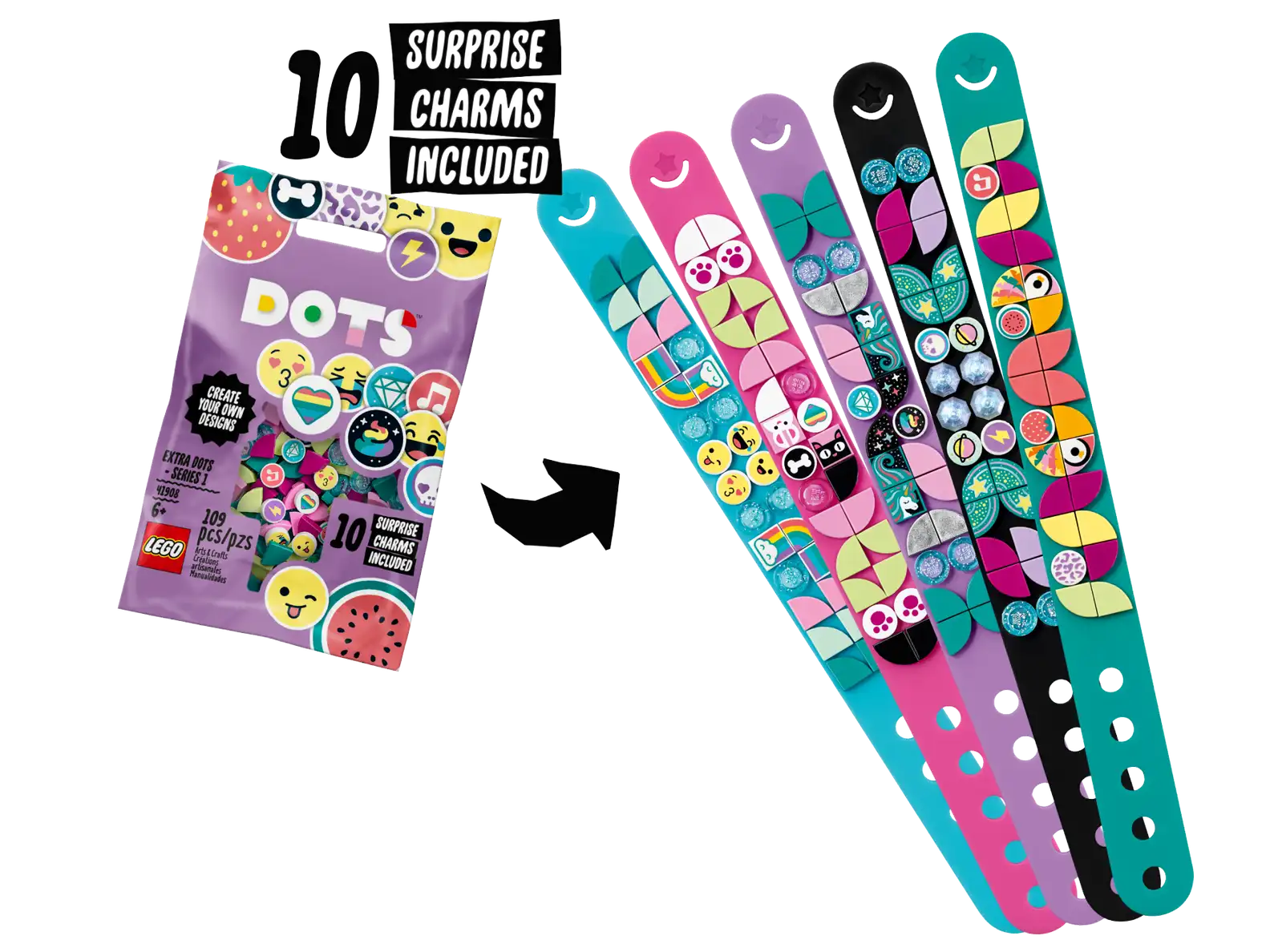 Kids and fans of arts and crafts items will love this cool LEGO® DOTS (41908) Extra DOTS - series 1 pack! Designed to work with all the LEGO DOTS sets, these extra tiles offer kids the chance to expand their designs in fun new ways and change them to suit their outfit, mood or room decor.Extra creativity in a bagThis great little pack includes 109 colorful tiles, including 20 translucent blue glitter tiles and 10 special printed tiles, to decorate their own creative jewelry or room decor items,stretch their imagination skills and have fun expressing themselves how they like.More arts and crafts items to make designing even more funThe joy of this little pack is the chance for kids to be even more imaginative in decorating their LEGO DOTS items however they like, to match their mood, to mix and match with their friends and to show off their own unique designs. They make great stocking stuffer gifts for Christmas or birthdays or make a great add-on purchase with any of the other DOTS sets.